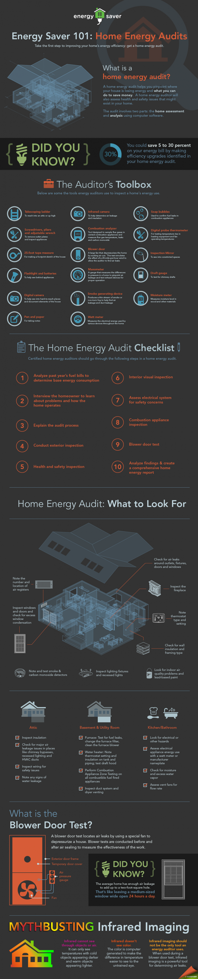An energy audit is a great way to identify areas where your home or business is wasting energy. One way to find these trouble areas is through the use of a blower door and thermal imaging camera. The blower door simulates a 15 mph wind, on the building. This simulated wind helps to locate areas where conditioned air is being wasted to the outside, or unconditioned air is being drawn indoors. In either case, this causes your HVAC system to work harder.